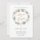 Elégante invitation au mariage avec une belle couronne botanique avec des feuilles verts et dorés en aquarelle.