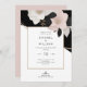 Faire-part de mariage élégante d'inspiration Chanel, avec des fleurs roses rousses et du feuillage sur fond noir spectaculaire. Un mélange de luxe, de sophistication et de romantisme.