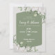 Il s'agit d'une faire-part de mariage au design simple et élégant. La palette de couleurs verte et blanche est parfaite pour un mariage de printemps ou d'été. L'élégante police avec des fleurs et des vignes délicates s'harmonise à n'importe quel thème mariage de printemps ou d'été.