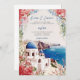 Ce faire-part de mariage présente un tableau du paysage de Santorin Grèce avec des fleurs roses. Modifiez facilement le libellé *most* pour répondre à vos besoins. Vous pouvez modifier la couleur de l'arrière - plan et ajouter votre propre photo à l'arrière.