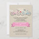 Les mariages sur le thème du vélo sont une nouvelle tendance amusante dans les mariages thématiques. Sur ce faux faire-part de mariage arrière - plan en lin, deux bicyclettes se rencontrent et font un coeur rouge pour symboliser leur mariage. La bicyclette de la mariée comporte un voile mariage sur le siège et un bouquet dans le panier. La moto du marié est équipée d'une cravate à archet entourée de guidons. Les noms du couple se distinguent dans une bannière rose assortie à l'avant et à l'arrière. Disponible en couleurs de bannières alternatives avec une option vélo tandem.