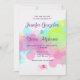 Une faire-part de mariage au design unique et joyeux, à l'apparence abstraite, créée avec des aquarelles. Un arc-en-ciel de couleurs s'infiltre sur la toile dans des couleurs estivales comme le jaune, le vert, le turquoise, le rose et plus. Des cercles et des éclaboussures dansent à travers la page dans une ligne horizontale sur un arrière - plan de couleur crème.