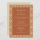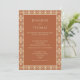faire-part de mariage boho de style vintage avec cadre décoratif et élégant serif et san serif combinaison de police en crème douce sur terre cuite arrière - plan à l'avant, et crème légère arrière - plan à l'arrière avec deux initiales