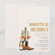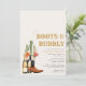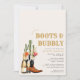 C'est parti, les filles ! Préparez-vous pour une virée sauvage dans le Far West ! Cette invitation de mariage Boots et Bulles est parfaite pour un mariage western ou une soirée d'enterrement de vie de jeune fille. Unique et originale, avec des cactus dessinés à la main et peints à l'aquarelle, des bottes de cowboy et des chapeaux faciles à personnaliser. Alors enfilez votre chapeau de cowboy et préparez-vous pour le dernier rodéo !