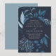 Notre faire-part de mariage Winter Azure entoure vos détails de mariage avec une bordure circulaire de feuillage aquarellé vibrant Un choix moderne mais organique pour les mariages d'hiver ou de printemps avec des éléments botaniques peints de manière complexe. Colorway : Winter Azure, un mélange de bleus gelés sur un arrière - plan de la marine.