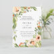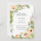 Couleurs rustiques des arrangements botaniques de l'aquarelle de pêche, faire-part de mariage. Caractéristiques de la carte, verdure à flot et fleurs de pêche délicates. Typographie chic et tendance avec coordination du support de couleur cantaloupe.