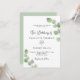 Un arrière - plan blanc décoré de sprigs de verdure d'eucalyptus. Personnalisez et votre nom et les détails de la cérémonie. Lettres de couleur noire. Retour : arrière - plan vert