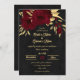 Invitation de mariage chic et élégante avec de belles fleurs bordeaux et quelques feuilles dorées élégantes.