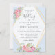 Cette belle invitation présente des fleurs roses douces, de la verdure et des touches de bleu poussiéreux sur un cadre doré. Un beau design pour votre mariage ! Facile à customiser avec votre texte mariage. Coordonner les accessoires mariages disponibles dans mon magasin. Design©Rosalind Moore, Cherry Lane Designs.