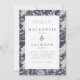 Une jolie et élégante invitation de mariage avec un motif à aquarelle fleurie arrière - plan d'hydrangées bleues et de feuilles sur un arrière - plan bleu ardoise foncé/charbon de bois, surmonté d'un double cadre rectangle. Les détails du mariage sont dans la police serif de fusain bleu ardoise. L'inverse est en bleu clair/poussiéreux. Cette conception fonctionnerait bien pour un mariage d'hiver.