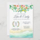 Ces invitations de mariage sont parfaites pour annoncer votre destination tropicale ou votre mariage sur la plage ! En haut de l'invitation, une couronne fleurie de plantes tropicaux. La base de l'invitation est constituée de vagues qui s'écrasent sur une plage. La couleur Arrière - plan des invitations peut être customisée, ainsi que tous les détails et informations.