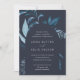 Notre faire-part de mariage Winter Azure entoure vos détails de jour de mariage avec une arche de feuillage aquarelle dynamique. Un choix moderne mais organique pour les mariages d'hiver ou de printemps avec des éléments botaniques peints de manière complexe. Colorway : Winter Azure, un mélange de bleus gelés sur un arrière - plan de la marine.