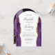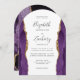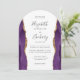 Cette élégante faire-part de mariage moderne en arc présente des bordures latérales d'aquarelle violette ornées de parties scintillant en faux or. Le texte personnalisable combine écriture manuscrite grise au fusain, cuivre et polices italiques sur un arrière - plan blanc. L'envers est assorti d'une agate violette et dorée.