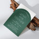 Faire-part de mariage d'arche de typographie moderne et détails avec QR Code à l'arrière dans les tons vert émeraude, Sherwood Green, Bottle Green, Sacramento State Green. Convient pour le thème de mariage du jardin botanique d'été.