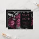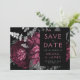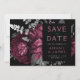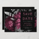 Ce mariage élégant et maussade Save the Date propose un bouquet floral luxuriant et romantique en rouge bordeaux avec fausse feuille argent et feuillage parties scintillant sur un arrière - plan noir. Customisez le texte gris argenté et bordeaux pâle dans des polices de caractères élégantes sur un rectangle noir, et ajoutez l'URL de votre site Web mariage au dos noir solide.