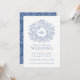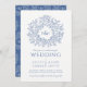 Invitations de mariage d'art botanique à feuilles de printemps en bleu et blanc. Un design de feuille simple encerclant votre propre design d'initiales monographiques. Dans de jolis tons de bleu classique et de blanc immaculé. D'autres couleurs et objets correspondants sont disponibles. © Dessin et dessin de la feuille d'origine par Sarah Trett pour www.mylittleedenweddings.com sur Zazzle.