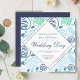 Faire-part de mariage d'art moderne unique bleu Abstrait d'une ligne. Une invitation unique avec un motif d'art abstrait bleu et vert dessiné à la main d'une ligne. Le texte se trouve à l'intérieur d'une forme diamant. Vous pouvez facilement customiser tout le texte - le personnaliser avec le nom de la mariée, le nom du marié, la date et l'heure, l'emplacement, et modifier ou effacer tout texte sur la carte.