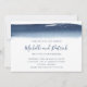 Faire-part de mariage horizontale moderne et créative, avec un design simple, avec un trait bleu marine d'aquarelle sur le dessus, sur un arrière - plan blanc. Ci-dessous sont vos noms dans une police manuscrite et vos détails mariages dans une police sans serif. L'arrière est un bleu marine solide. Ces invitations uniques sont parfaites pour un couple artistique.