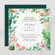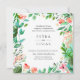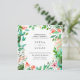 Belles fleurs tropicales d'île rose, pêche et corail avec cadre de branches botaniques vertes, faire-part de mariage. Le dos de la carte est de couleur turquoise profonde.