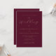 Cette faire-part de mariage simple et moderne présente un texte de couleur or sur un arrière - plan bordeaux, avec les mots "le Mariage de" dans une élégante calligraphie manuscrite. Ajoutez les noms du couple dans serif et les détails du mariage dans la police sans serif. L'envers offre de l'espace pour les détails du mariage, ainsi qu'un code QR que les clients peuvent scanner pour visiter votre site Web et RSVP, ce qui permet d'économiser le coût d'impression et d'envoi de RSVP séparés.