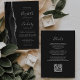 Le bord gauche de cette élégante faire-part de mariage moderne est orné d'une bordure en aquarelle noire et d'une parties scintillant en faux argent. Le texte personnalisable combine écriture manuscrite, copperplate et polices italiques en gris argenté clair sur un arrière - plan non noir. L'envers offre de l'espace pour les détails du mariage sur un arrière - plan sombre solide, ainsi qu'un code QR que les invités peuvent scanner pour visiter votre site Web et RSVP, ce qui permet d'économiser le coût d'impression et d'envoi de cartes RSVP séparées.