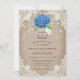 Des invitations à un mariage d'hydrangée bleu rustique avec une hydrangée et un bouquet de respiration pour bébé dans un bocal de mason sur un burlap et un arrière - plan de dentelle fleurie. Un design de carte idéal pour inviter vos invités à votre mariage campagnard bleu rustique inspiré des fleurs d'hortensia. Carte facile à personnaliser.