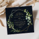 Ce faire-part de mariage en diamant bleu vert et géométrique doré est parfait pour un mariage moderne. Le design présente de beaux feuilles verts peints à la main dans un arrière - plan bleu foncé, ornant un cadre géométrique doré.
