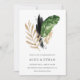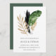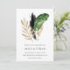 Le faire-part de mariage est doté d'une végétation tropicale et d'un feuillage doré. Parfait pour l'été et éco-mariages modernes.