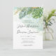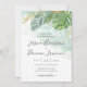 Un élégant faire-part de mariage de style tropical branché, avec un palmier vert et or à l'aquarelle et des feuilles monstères avec calligraphie moderne.