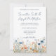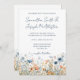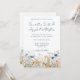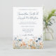Créez votre propre faire-part de mariage fleur sauvage aquarelle. Les styles de police sont un choix de style d'écriture moderne jumelé à une élégante police de caractères tous casquette. La bordure fleurie de l'art numérique est recouverte de bleu poussiéreux et de fleurs sauvages d'orange pêche.