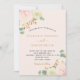 Un arrière - plan d'or rose clair et aéré. Décoré de fleurs aquarellées, de fleurs roses florales, d'orchidées blanches et d'une gerbera jaune clair, de végétation d'eucalyptus et de sprigs en faux or. Personnalisez et ajoutez vos noms et les détails du mariage. Lettres de couleur noire. Retour : arrière - plan rose d'or.