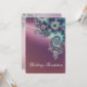 Une élégante invitation de mariage avec un design fractal en spirale, avec des motifs fleuris comme des bijoux avec des ombres soyeux dans les tons turquoise, violet et bleu foncé sur le devant et une version plus pâle au verso. La police de script est en blanc et bleu foncé, mais peut être customisée à une autre couleur.