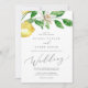 Cette carte d'invitation au mariage moderne au jardin de citron est parfaite pour un mariage de printemps ou d'été. Le design méditerranéen rustique présente de beaux citrons aquarellés aux fleurs blanches bohème et d'élégants feuilles verts.