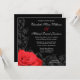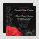 Belle faire-part de mariage à thème fleuri. Doté d'une rose rouge classique avec d'élégants tourbillons fleuris sur un arrière - plan noir. Flore par © Mujka Design