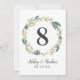 Les cartes de numéro de la table de mariage de style romantique boisé comportent des numéros encadrés par une couronne d'aquarelle fleurie avec des roses peints, des fleurs de ranunculus et des feuilles. Le jeu de couleurs comprend des tons neutres de blanc, crème, or, vert et gris foncé / noir doux. Parfait pour un événement de printemps ou d'été.