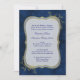 Faire-part de mariage chic et sophistiquée, dans un arrière - plan bleu foncé, avec un effet tinkling. Des sprigs décoratifs en feuille d'or entourent la zone de texte encadrée d'or opulente. Le texte bleu personnalisé est prêt à être personnalisé pour votre journée spéciale. Produits correspondants disponibles.