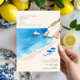Faire-part de mariage illustrant une aquarelle d'une plage méditerranéenne pittoresque avec deux parapluies bleus.
