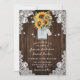 Faire-part de mariage de tournesol rustique avec un bouquet de tournesol à l'intérieur d'un bocal de maçon contre un arrière - plan en bois de grange orné de dentelle fleurie blanche et de lampes à cordes. Un design de carte parfait pour inviter vos invités à votre fête de mariage sur le thème rustique inspiré des tournesols. Conception entièrement personnalisable.