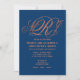 Cette élégante invitation a un monogramme entrelacé en caractères de script dans les nuances de cuivre sur un arrière - plan bleu marine. Photo à l'arrière.
