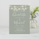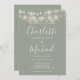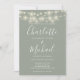 Elégante faire-part de mariage de signature verte sauge avec de jolies lampes à cordes et des noms de style signature, ce faire-part de mariage élégant peut être personnalisé avec vos informations en lettrage blanc chic. Conçu par Thisisnotme©