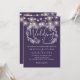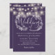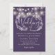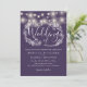 Un faire-part de mariage violet avec de jolies lampes à cordes et une délicate guirlande florale rustique dessinée à la main de feuillage de feuilles botaniques avec typographie stylisée. Personnalisez avec vos informations spéciales pour le jour de mariage. Conçu par Thisisnotme©