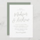 Invitations minimalistes de mariage avec vos noms affichés dans un simple script vert sauge avec vos détails mariages ci-dessous. L'invitation revient à un arrière - plan vert sage solide.