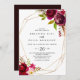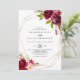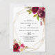Cette faire-part de mariage décontractée aux motifs géométriques bordeaux est parfaite pour un mariage moderne. Le design est composé de fleurs roses, rousses, bordeaux et bordeaux à aquarelle vert, ornées d'un cadre géométrique doré.