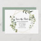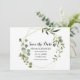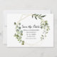 Ce mariage tropical vert feuille sauf l'invitation de la date est parfait pour un mariage simple. Le design présente de beaux feuilles verts peints à la main, ornant un cadre géométrique doré.