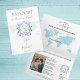 Carte du monde moderne et élégant Invitation Mariage Destination, comme passeport avec monogramme bleu poussiéreux d'aquarelle crête florale