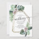 Mariage d'été à thème tropical, aquarelle fleurie et verdure, avec cadre géométrique. Eté tropical, destination ou thème de mariage de plage.