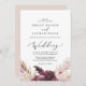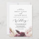Cette carte de faire-part de mariage en herbe de pampas boho est parfaite pour un mariage d'été. L'aquarelle fleurie présente des fleurs bohèmes bordeaux et roses rousses avec des sprigs de pampa neutres et des feuilles de palmiers séchés dorés.