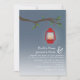 Un faire-part de mariage en plein air le soir avec une illustration d'une lanterne à huile rouge accrochée à une branche d'arbre avec des feuilles verts. Personnalisez le texte avec vos informations.