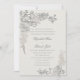 Un cadre floral époustouflant avec des pivoines comme pièces centrales, avec des fleurs de mariage et des feuillages comme l'eucalyptus, des fleurs stocks, des fougères, des fleurs de veronica et plus encore, dessiné à la main et revêtu d'un effet imbriqué, décore ce modèle formel élégant et sophistiqué qui présente une calligraphie élégante avec des fleurs délicates pour les noms, ainsi que les noms des parents dans le libellé avec les parents de la mariée accueillant. Le design noir et blanc avec une touche de champagne et d'or très délicate, sur un arrière - plan écru, accompagne parfaitement une élégance formelle et s'intègre avec de nombreux coloris. Ce faire-part de mariage d'art est un choix agréable pour les couples qui aiment l'art, les dessins artistiques, l'art unique et original et les modèles mariages traditionnels formels. Customisez chaque ligne de texte. Éléments correspondants disponibles.