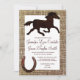 Ce faire-part de mariage occidental de pays rustique est parfait pour n'importe quel mariage occidental de pays ou mariage de cowboy. Il comporte une conception de toile de jute imprimée par pays rustique des deux côtés de l'invitation avec un cheval fonctionnant au dessus et une conception de chaussure de cheval au dessus. Le dos de l'invitation a la mêmes toile de jute rustique de pays, cheval, et conception en fer à cheval avec le mot "amour" en manuscrit. C'est un faire-part unique de mariage pour un mariage ou un mariage campagnard de cowboy. Vous pourriez changer ce mot en noms des jeunes mariés si vous voulez. Employez juste la "personnaliser il" bouton.